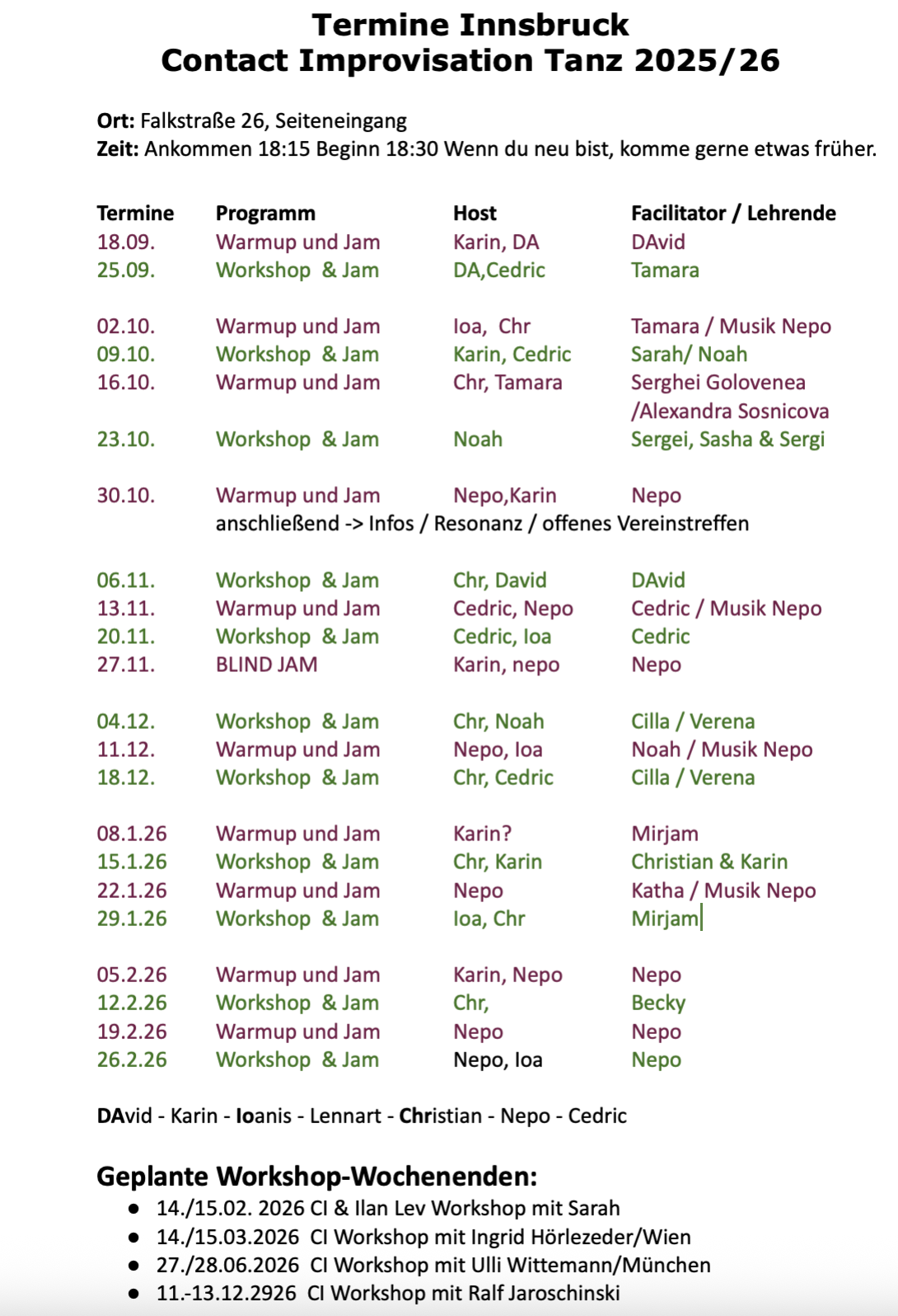 mit Contact Improvisation Jam und Workshop (wöchentlich im Wechsel)